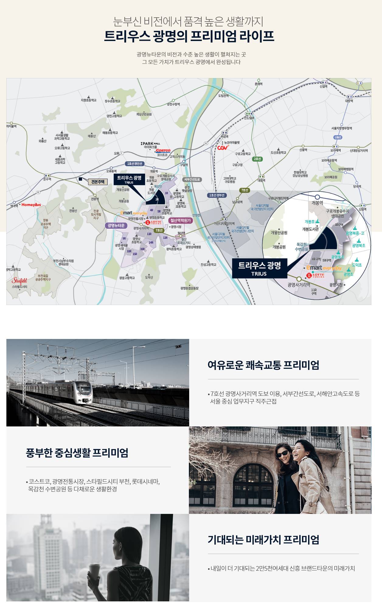광명의 비전을 완성하는 소하동의 새로운 중심 KTX 광명역세권과 소하지구의 인프라를 동시에 누리는 입지 광명 소하 파크 타워는 주거와 상업 그리고 비즈니스가 조화를 이루는 광명 소하동의 핵심적인 위치를 선점하고 있습니다. 강남과 서울을 빠르게 잇는 쾌속 교통망 소하 IC를 통해 강남순환고속도로와 바로 연결되는 이동권 강남순환도로와 서해안고속도로 등 주요 도로망 진입이 용이하여 강남 및 서울 주요 도심으로의 빠른 접근성을 제공합니다. 구름산과 공원을 품은 도심 속 힐링 환경 숲세권의 쾌적함과 도시의 편리함을 모두 갖춘 단지 단지 인근의 구름산 산책로와 녹지 공간을 통해 일과 휴식이 공존하는 여유로운 생활 환경을 만끽할 수 있습니다. 이케아와 코스트코 등 완벽한 생활 인프라 세계적인 쇼핑 시설과 대형 병원이 인접한 편리한 생활권 이케아, 코스트코, 중앙대 광명병원 등 광명역세권의 풍부한 생활 인프라를 단지 가까이에서 편리하게 이용합니다. 비즈니스의 효율을 높이는 혁신적인 공간 설계 입주자의 편의를 고려한 세련된 외관과 실용적인 내부 계획 현대적인 감각의 타워 설계와 공간 효율성을 극대화한 평면 구성을 통해 사용자 중심의 쾌적한 공간 활용이 가능합니다. 지속적인 개발 호재와 미래 가치 상승 기대 광명의 대규모 주거 정비 사업과 연계된 프리미엄 비전 광명시의 지속적인 개발과 테크노밸리 등 배후 수요 확대로 시간이 흐를수록 더 높게 평가받는 투 가치를 제공합니다.